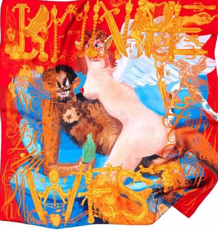 Kanye Wet has commissioned a line of scarves with French design partnership M/M (Paris). Starting Monday, Ye will be hawking five limited-edition designs, based on paintings George Condo made for the cover of the My Beautiful Dark Twisted Fantasy album and Kanye's other musical fantasies.